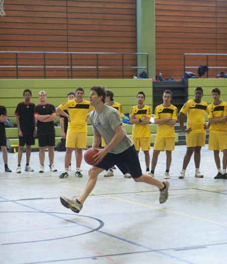 Adam Baumann und Aaron Bowser vom Regionalligisten BG Hagen führten in der Pause einige basketballerische Leckerbissen vor und coachten anschliessend noch ein Spiel der Gastgeber.